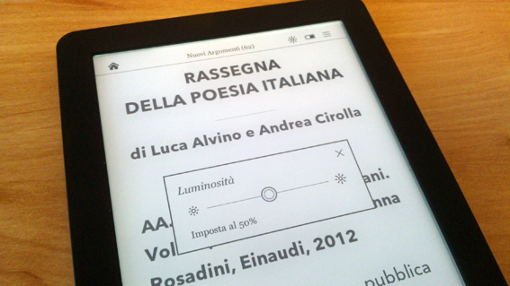 Il cambio pagina è molto veloce, non ha avuto incertezze in questa settimana di prove, si ha meno la sensazione di avere un “semplice” schermo a inchiostro elettronico sotto gli occhi; la luce mi è parsa distribuirsi in modo più uniforme sullo schermo rispetto al Kobo Glo ma farò altre verifiche; l’accesso al menu è immediato, l’impressione generale, almeno per quel che mi riguarda, è di avere finalmente un lettore digitale così come sarebbe sempre dovuto essere: veloce come un tablet ma contemporaneamente adatto a una lettura riposante sia di giorno sia di notte. Ho avuto modo di testare sia epub sia PDF – scriverò un post a parte su cosa significhi leggere un PDF sul Kobo Aura HD, non siamo ancora al top.