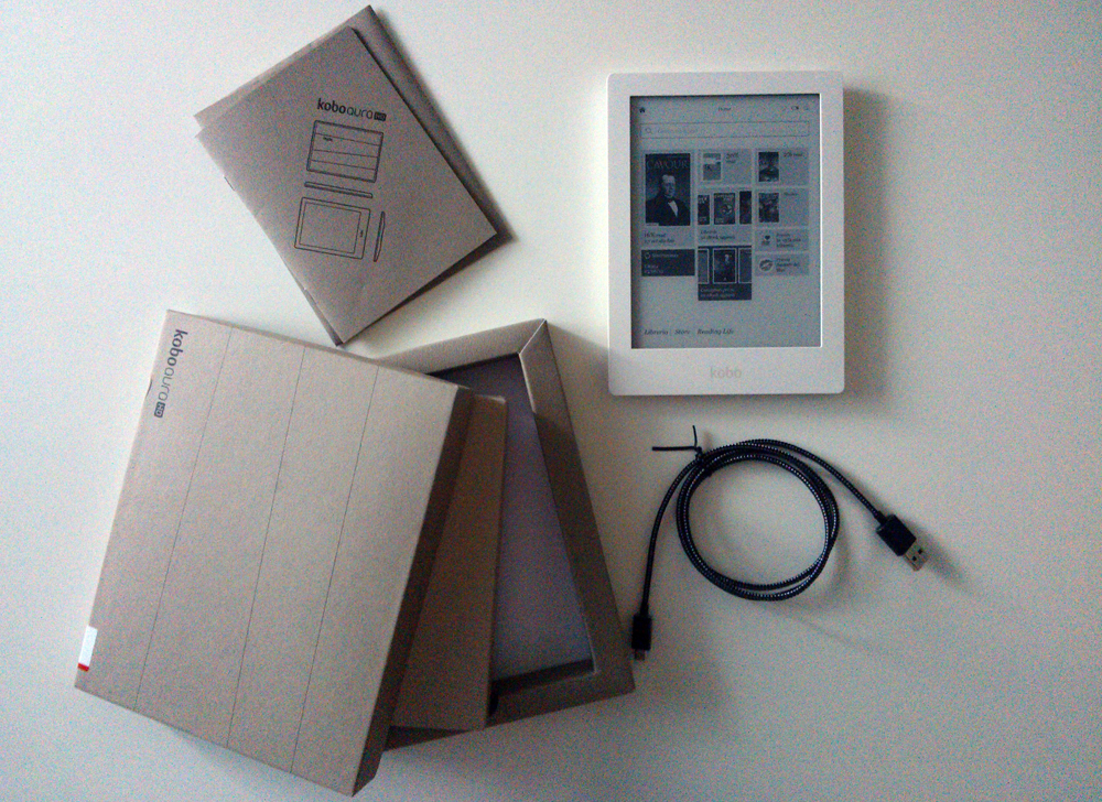Cosa trovo dentro la scatola? Mettiamo che vogliate fare un regalo al vostro lettore forte preferito, un amico o un parente, magari refrattario agli ebook reader, l’Aura HD si presenta bene? Sì e no; il dispositivo in sé è solido (ha un curioso retro sfaccettato ovvero non lineare ma piacevole al tatto), si impugna bene a due mani e bianco è elegante, il fatto che sia anche leggero gli toglie un po’ di valore percepito. La spartana confezione in cartone pressato non contiene nulla di più delle istruzioni e del cavetto USB per la ricarica (non con rivestimenno in gomma ma tessuto), un adattatore per attaccarlo alla corrente dato il costo sarebbe stato gradito.