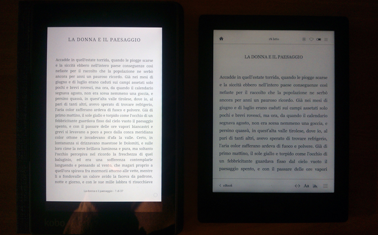 Soprattutto mi è decisamente piaciuta la ComfortLight PRO già presente sul Kobo Aura ONE. In pratica l’ereader dispone di una regolazione automatica dell’illuminazione delle schermo. Se al mattinno la predominante è una luce fredda e azzurra man mano che il giorno cede spazio alla sera e poi alla notte passa a una luce sempre più calda e arancione. Nel mio caso non l’ho trovata una sparata pubblicitaria, come può sembrare a chi non l’ha mai provata, ma – leggendo perlopiù dopo le 21 – una modalità effettivamente più rilassante per la lettura notturna rispetto a quanto precedentemente osservato con l’illuminazione del Kobo Glo e del Kobo Aura HD che è sempre “blu”.