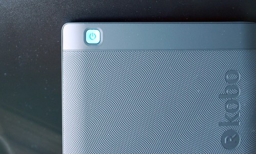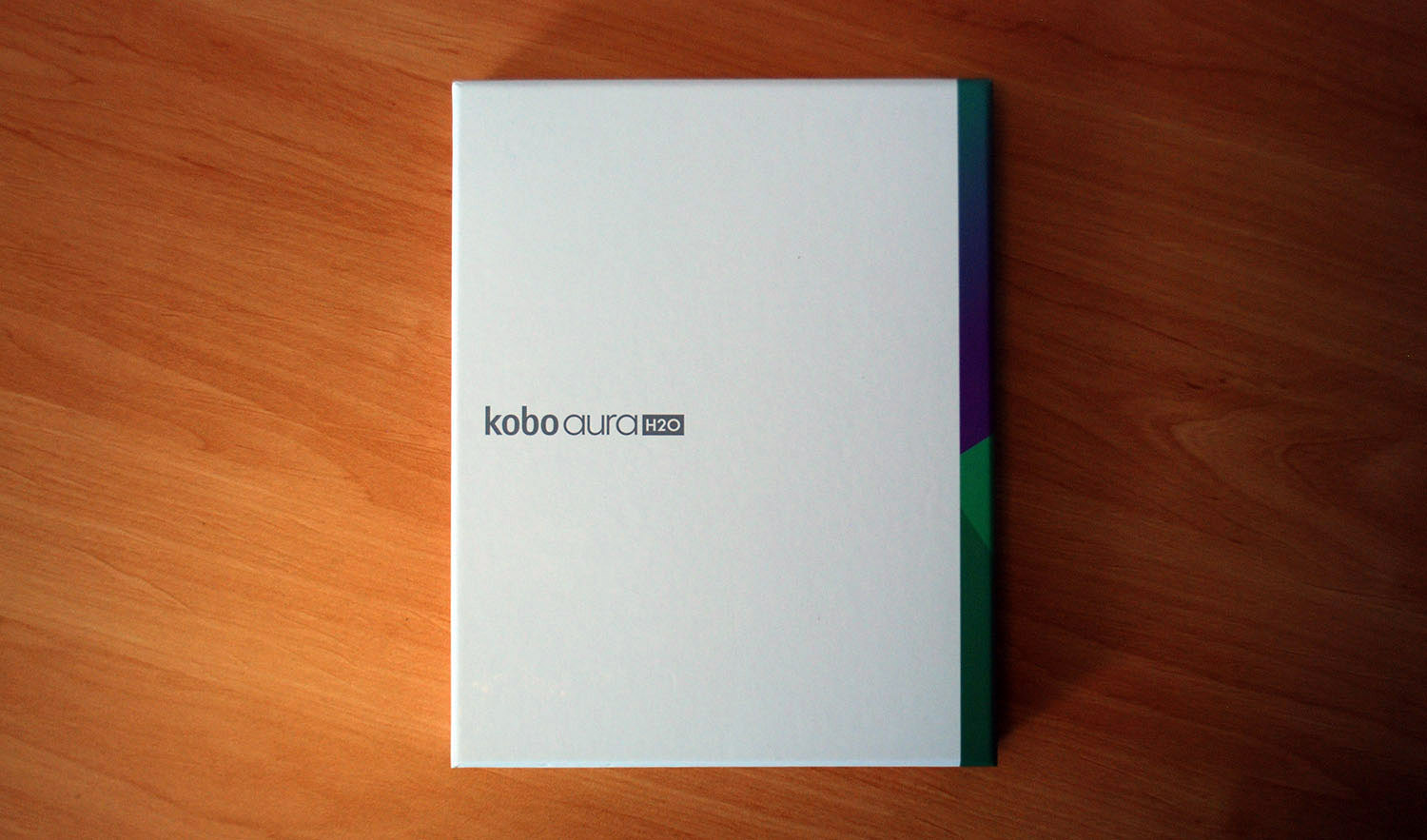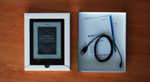 Il Kobo Aura H2O – nella prima foto l’esterno della confezione, molto elegante; nella seconda l’interno dove troverete l’ereader, le istruzioni e il cavo USB per connetterlo a un computer o tramite un trasformatore, non in dotazione, a una presa – è un lettore leggero, poco più di due etti (207 g), ed ergonomico grazie al retro zigrinato cui i polpastrelli delle dita aderiscono bene. Come gran parte dei lettori di questo sito sanno una cover protettiva vanificherà purtroppo la piacevolezza della presa; anche la sleepcover ufficiale lascia scoperto solo il pulsante di accensione/standby. Abituato come sono alla levetta del Kobo Aura HD, posta sul lato corto in alto, ho trovato un po’ scomodo il tasto messo sul retro ma immagino sia questione di prenderci la mano.