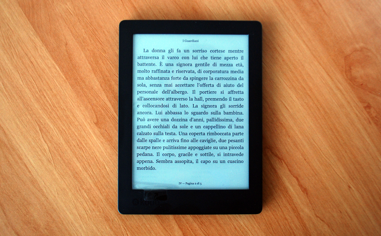 Nell’immagine sopra la schermata dell’Aura H2O Edition 2 acceso su una pagina de I guardiani di Maurizio de Giovanni; c’è sopra ancora la pellicola protettiva ma credo si possa capire l’alto livello di nitidezza dello schermo Carta eInk. La batteria non ho potuto testarla a dovere in soli dieci giorni ma disattivando l’antenna wi-fi (ricordo che l’Aura H2O Edition 2 non ha altro modo per connettersi alla rete, non alloggia SIM) l’autonomia dichiarata è di “diverse settimane” (sic!); rispetto al Kobo Aura H2O precedente è stata raddoppiata la capienza della memoria interna che passa da 4GB a 8GB.