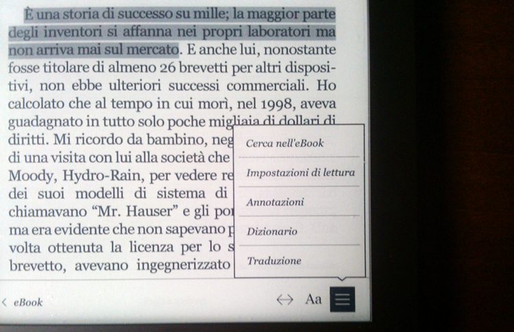 Perché ho scritto “finora”? Perché agli ingegneri di Kobo piace cambiare, come le scale di Hogwarts nei libri di Harry Potter, può darsi vale a dire che nella prossima versione del firmware, tra qualche mese, decidano che l’interfaccia utente così non va bene e la modifichino un’altra volta. Sarà che sono un utente della prima ora ma ne ho visti troppi di cambiamenti. Un menu personalizzabile sarebbe una soluzione, chissà che non ci si arrivi.