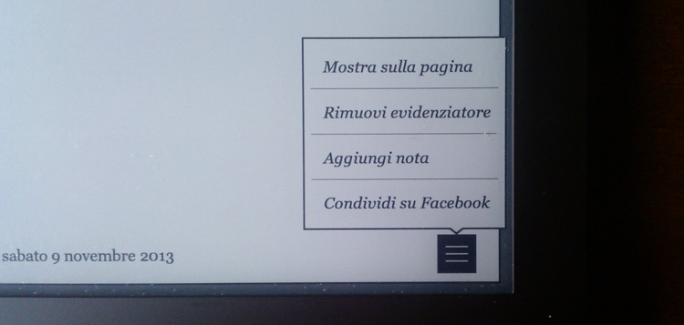 1) Posso evidenziare il passaggio senza prendere note, una striscia grigia mi ricorderà che la frase mi aveva colpito; 2) Posso aggiungere una nota legata alla parola e/o alla frase sottolineata. Entrambe le opzioni – la prima ha l’icona di una matita, la seconda di un post-it – sono recuperabili alla voce Annotazioni del menu di navigazione del Kobo Touch. Oppure 3) posso condividere la nota direttamente su Facebook.