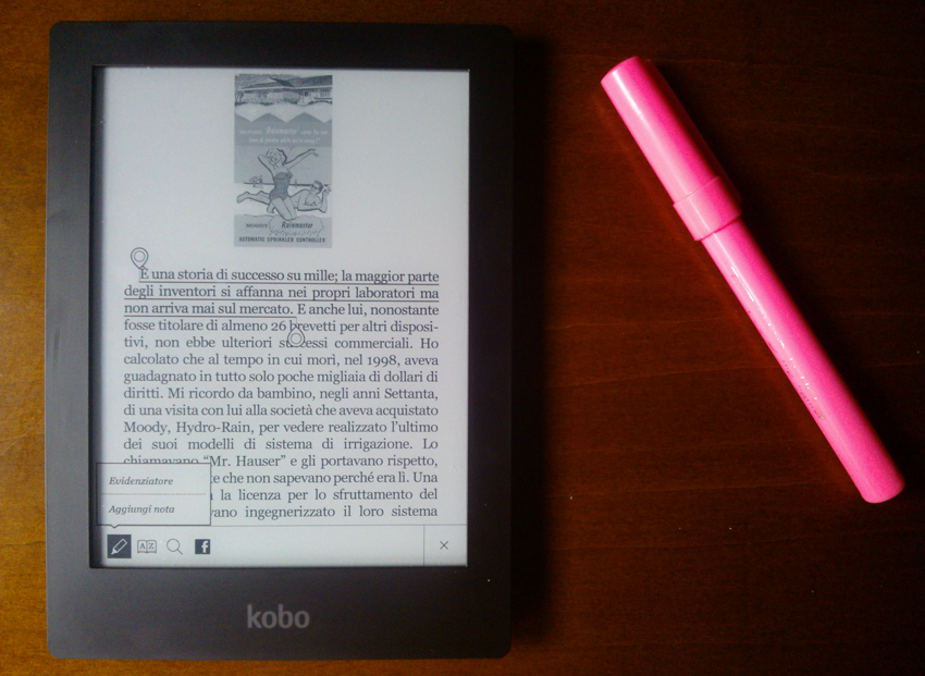 Vi ho già spiegato in un altro post come sottolineare, prendere note e (nei commenti) rimuovere evidenziature su un Kobo Touch, un ripasso però non fa mai male, magari corredato da fotografie. Vi mostro come si fa su un Kobo Aura HD ma la procedura è la stessa per Mini, Touch, Glo e Aura naturalmente, se mi sbaglio “mi corrigerete”. E allora bando alle ciance rivediamo insieme come si fa 🙂