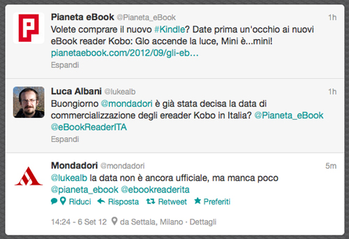 Aggiornamento 01/10: Mondadori ha annunciato che Kobo Glo (129 euro) e Kobo Mini (79 euro) saranno disponibili nelle librerie della sua catena a partire da metà ottobre, il Kobo Touch già da domani, martedì 2 ottobre, a 99 euro. E il Kobo Arc? Proverò a chiedere all’azienda se ha intenzione di portare il tablet Kobo in Italia prima di natale e vediamo cosa risponderà 😉
